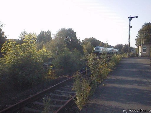Diese Zugbegegnung (614,628) fand im Sommerfahrplan 2000 immer um 18:45 statt. Besonderheit hier: Die Züge fahren gleichzeitig an !