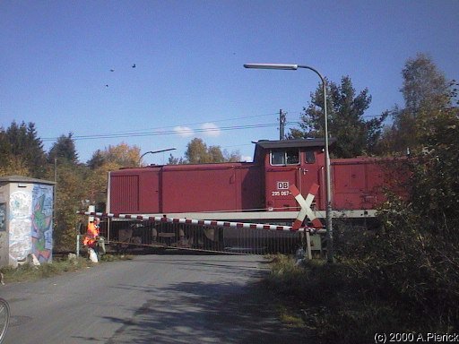 Die "Müllzug-Abhol-Lok" auf dem Weg nach Watenbüttel nähert sich dem Bahnübergang Ottenroder Straße. Weiterer Schrankenbedienungsablauf: Siehe Seite 17 und Seite 18.