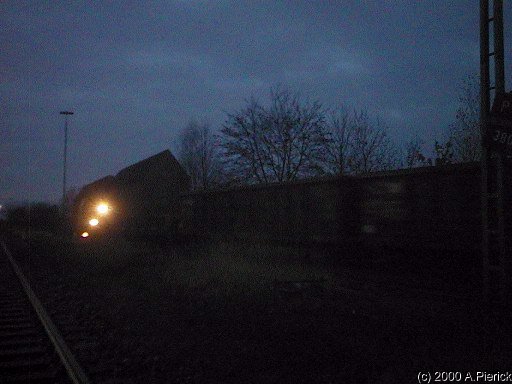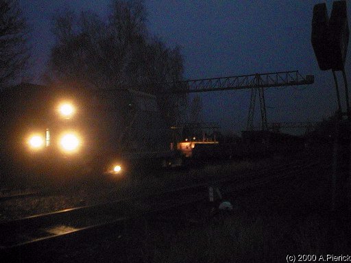 Und nachdem der einzelne Wagen nach weiterer Rangierarbeit nun im Anschluß steht, geht es mit den drei abzuholenden Wagen (in völliger Dunkelheit) wieder los in Richtung Braunschweig-Gliesmarode...