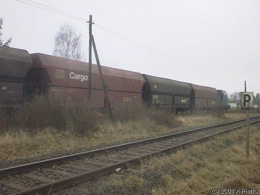 Kurz darauf passiert der mittägliche Güterzug nach Rühme das Ausfahrsignal des Bahnhofs in Richtung Rühme - die Streckenkapazität wird an diesem Tage voll genutzt.